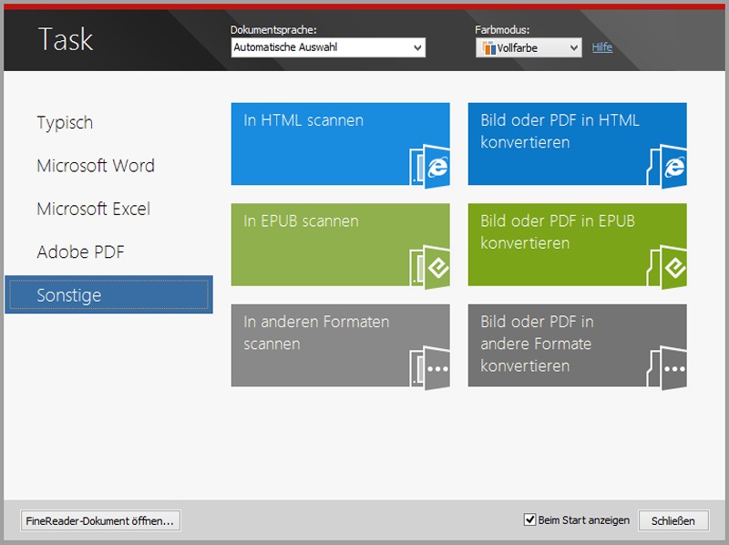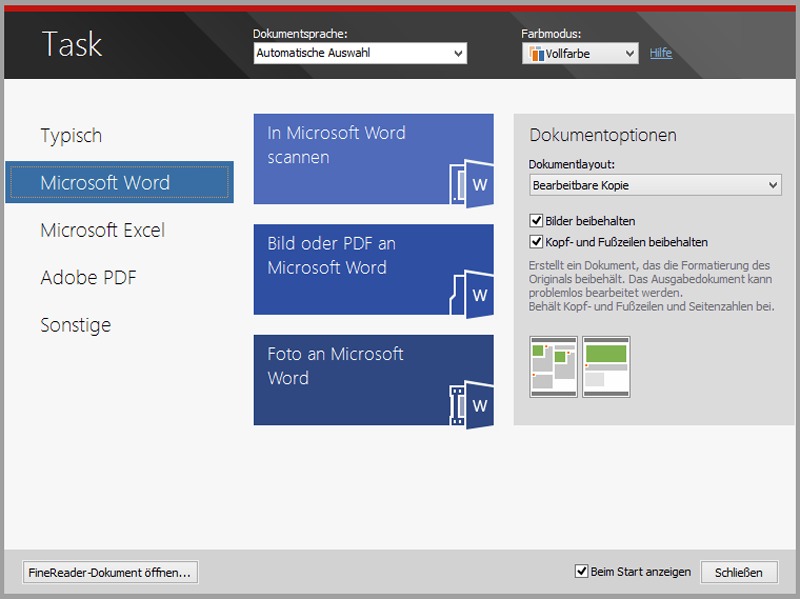 ABBYYs ausgezeichnete Erkennungs- und Umwandlungstechnologie macht das Abtippen und Neuformatieren von Dokumenten überflüssig, denn Layout und Formatierung des Ausgangsdokuments werden beibehalten, einschließlich Kopf- und Fußzeilen, Fußnoten, Tabellen, Diagramme und Schau bilder. Das schnelle Öffnen von Dokumenten und die verbesserte OCR-Verarbeitung im Hintergrund ermöglichen Ihnen den sofortigen Zugriff auf Ihre Informationen. Erweiterte Verifizierungs- und Korrektur- Tools erleichtern Ihnen die Überprüfung der OCR-Ergebnisse. FineReader wendet automatisch die optimale Bildvorverarbeitung an und liefert damit hervorragende Erkennungsergebnisse bei Scans sowie Fotos von Smartphones und Digitalkameras. Automatisierte Quick-Tasks ermöglichen Ihnen einen schnellen Zugriff auf häufige OCR-Szenarien – schaffen Sie mehr in kürzerer Zeit.