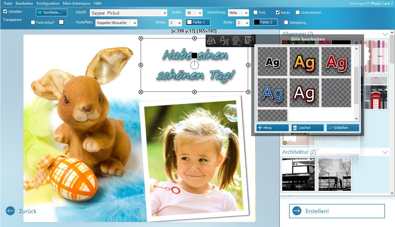 Eine Grußkarte benötigt natürlich auch eine Botschaft. Mit Ashampoo Photo Card 2 haben Sie neben der Möglichkeit, Texte einzufügen und diese nach Ihren Wünschen zu stylen, auch Zugriff auf eine umfangreiche Clipart-Bibliothek.