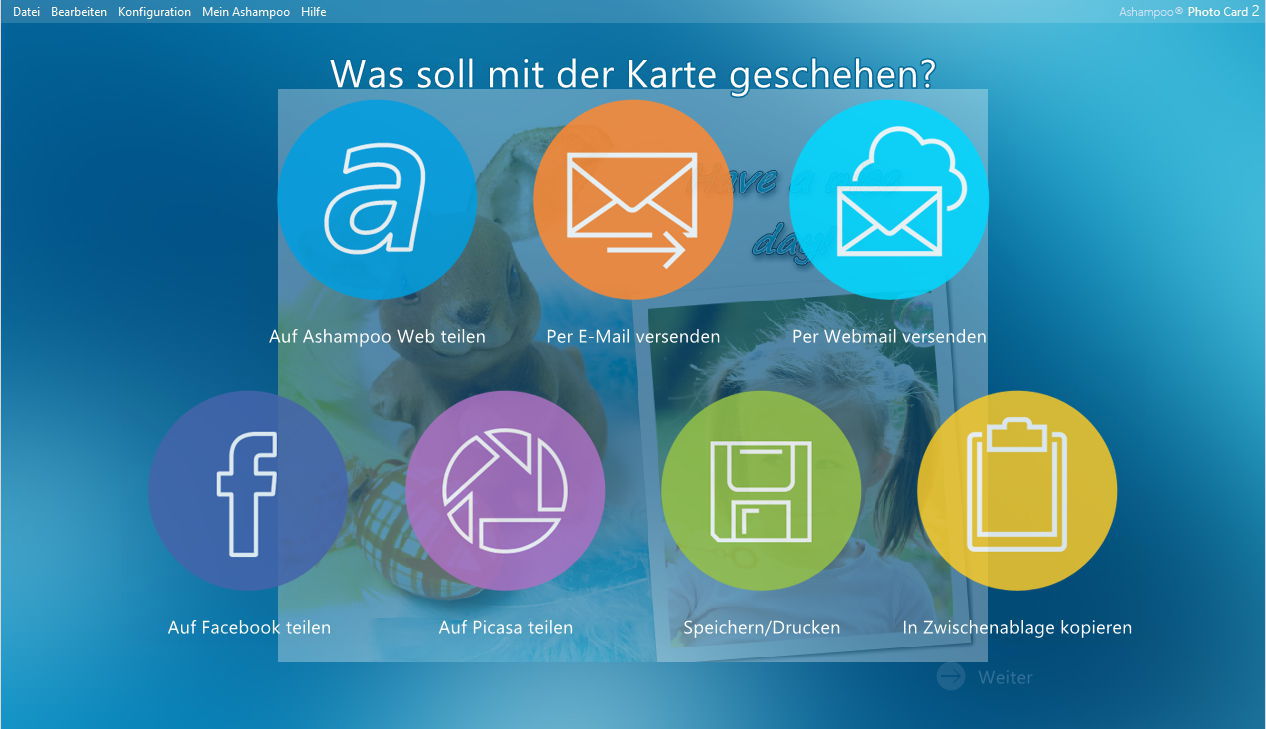 Der Versand der fertigen Karte erfolgt ohne Umwege direkt aus dem Programm heraus. Zur Auswahl stehen neben der klassischen E-Mail dabei das Ashampoo-eigene Web-Portal, bei dem Dateien nach 30 Tagen automatisch entfernt werden, sowie Facebook und Picasa.