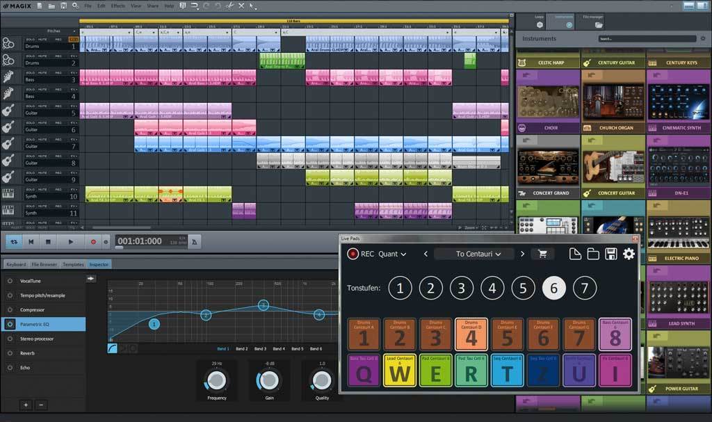 Professioneller Sound – selbst, wenn du kein Profi bist. MAGIX Music Maker Premium kommt mit der neuen VST3Schnittstelle, 6.500 Sounds & Loops, einer kostenlosen Zusatzapp und 12 virtuellen Instrumenten. Die Loops, Sounds & Samples lassen sich einfach per Drag & Drop arrangieren und die virtuellen Instrumente sogar per Touch mit dem Bildschirmkeyboard spielen. Das Touchoptimierte Bildschirmkeyboard bietet jetzt einen weiteren Modus, mit dem du in 7 Skalen immer in der passenden Tonart spielst. Der Effektund Masteringbereich ist komplett überarbeitet und der neue integrierte Élastique Pro-Algorithmus von zplane gilt weltweit als einer der besten für die Anpassung von Geschwindigkeiten & Tonhöhen.