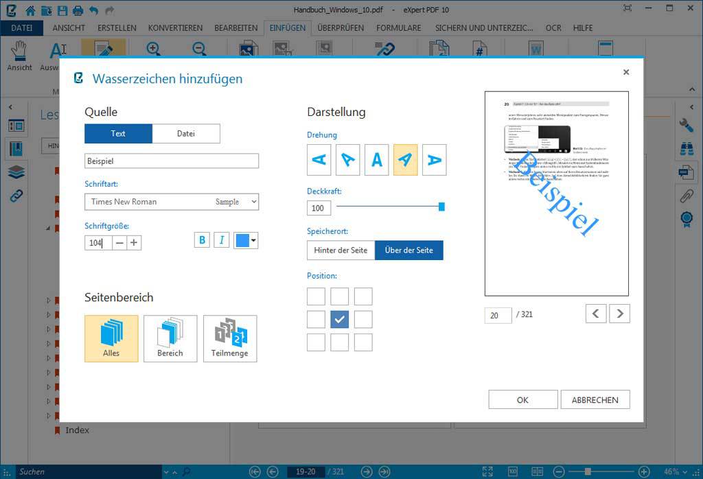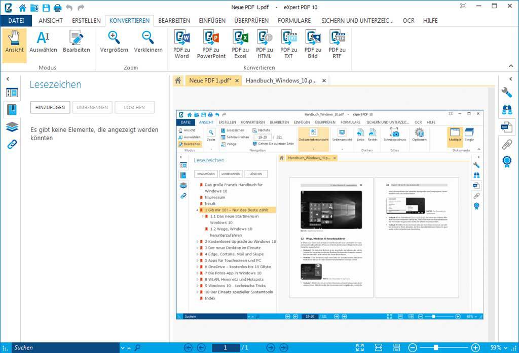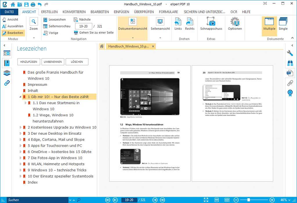 PDF Experte 10 lässt Sie sämtliche PDF-Dateien, sowie ePub und Comic-Book-Dateien öffnen und ansehen. Somit ersparen Sie sich Probleme beim Öffnen von verschiedensten Anhängen. Erstellen Sie weiterhin Ihre PDFs aus den unterschiedlichsten Ausgangsdokumenten (z.B. Aus Microsoft Office Dateien). Kombinieren Sie unterschiedliche PDFs, entfernen Sie einzelne Seiten oder editieren Sie Text und Bild. Jedes PDF gehorcht Ihnen aufs Wort.