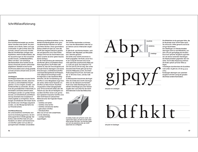 Der ausführliche Typografie-Teil des Buchs vermittelt leicht verständlich die Grundlagen der Schriftgestaltung und alle wichtigen Begriffe: angefangen bei den Ursprüngen, die unsere Schrift bis heute prägen, über den grafischen Aufbau einzelner Buchstabenteile bis hin zur Seitengestaltung und dem Zusammenspiel von Schrift, Bildern und Auszeichnungen.