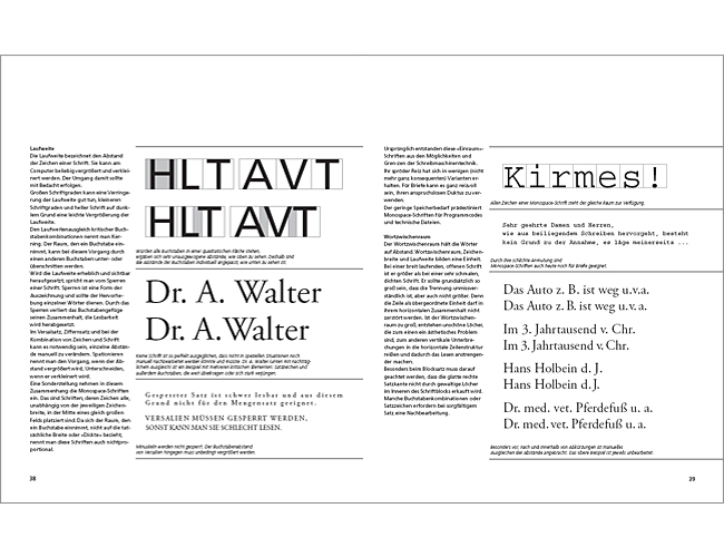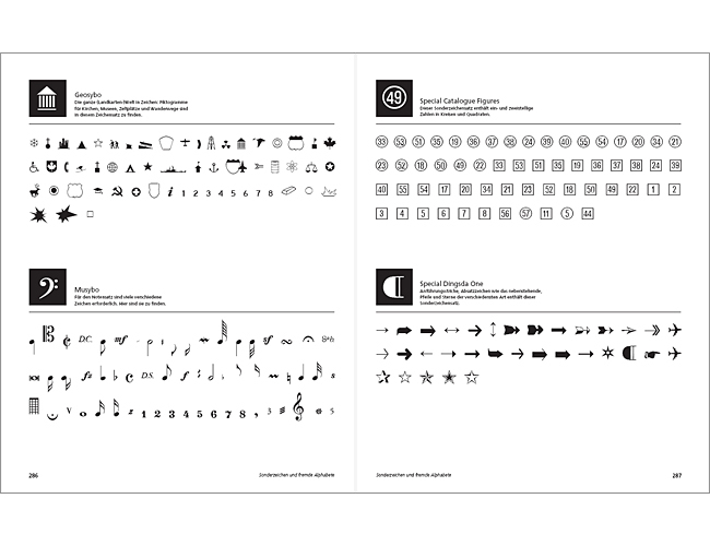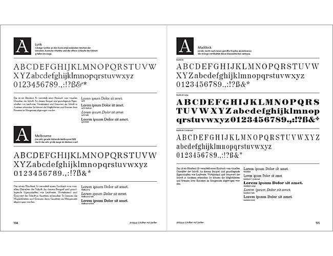 - Umfassender Schriftenkatalog mit charakterisierendem Text, verschiedenen Darstellungsweisen und einer Übersicht der Schriftschnitte
