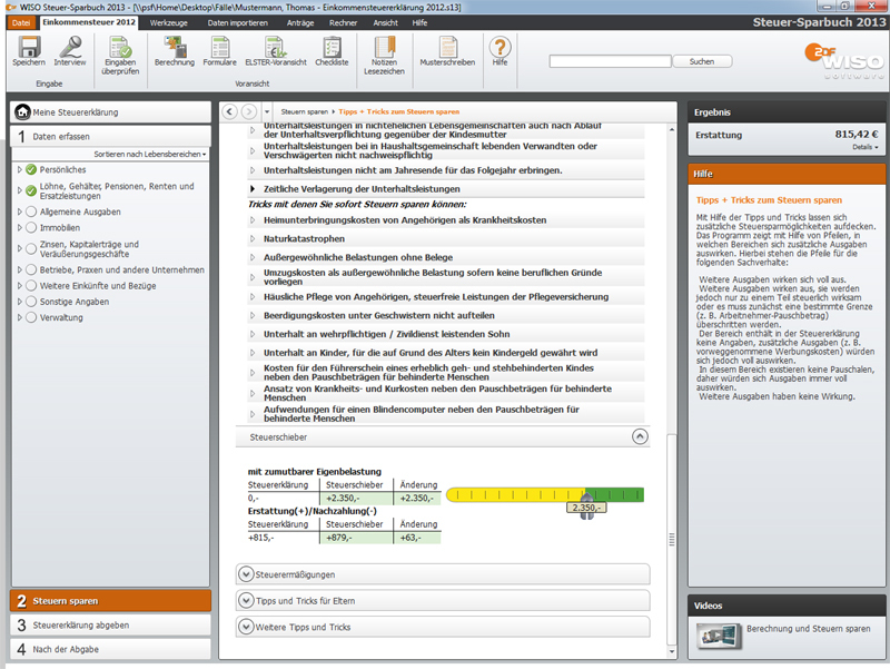Die erste Wahl für alle, die Steuern sparen wollen. Machen Sie die Einkommensteuer 2012 einfach selbst am PC. Das WISO Steuer-Sparbuch führt Sie am Bildschirm mit cleveren Tipps zur optimalen Erstattung. Ob Sie berufstätig sind oder schon im Ruhestand, mit der WISO Software meistern Sie Ihren Fall.