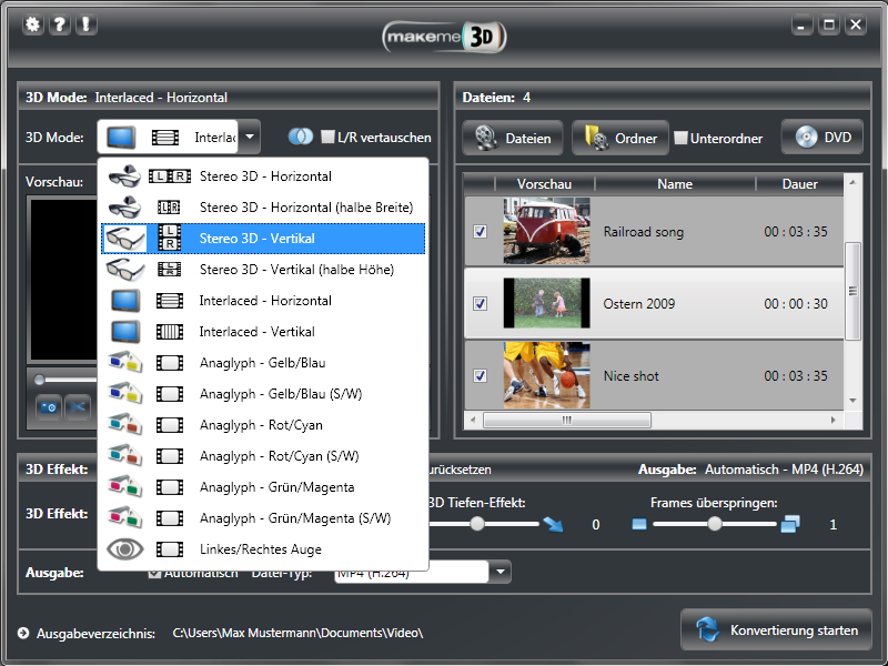 MakeMe3D ist kinderleicht zu bedienen: Neue Technik muss nicht auch noch schwierig sein. Das Programm unterstützt den Import von 2D-Videos u.a in den Formaten Video-DVD, AVI, WMV, MP4, 3GP, MPG und TS, um nur die wichtigsten zu nennen. Die konvertierten 3D-Videos speichert das Programm in den Formaten AVI, MPG, MP4 und WMV. Dabei ist es möglich, aus vielen Zielprofilen zu wählen. So werden die Videos u.a. automatisch von der Auflösung her an die Vorgaben für das iPad, die PlayStation PS3 oder die Xbox 360 angepasst. Wer sehr viele 2D-Videos umwandeln möchte, kann dies gern im Batch-Modus tun. Die Stapelverarbeitung konvertiert alle Videos aus einer Liste und spart dem Anwender so viel Zeit ein.