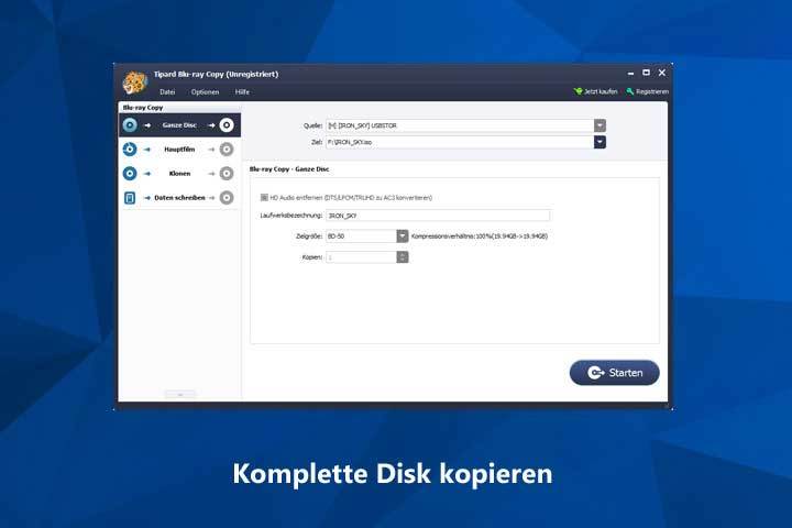 Kopieren und speichern Sie ungeschützte Blu-ray/Ordner/ISO Dateien 1:1 ohne Qualitätsverlust. Tipard Blu-ray Copy ist für alle Typen von ungeschützten Blu-ray-Disks (2D/3D) geeignet. Sichern Sie Ihre eigenen Blu-ray Ordner/ISO Dateien auf vier verschieden Wegen: 1. Komplette Disk, 2. Hauptfilm, 3. 1:1 Klonen und 4. Daten schreiben.
