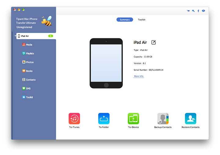 Tipard Mac iPhone Transfer kann Musik, Fotos, Kontakte, Klingeltöne, ePub und PDF Dateien usw. von Ihrem Mac auf Ihr iPhone binnen weniger Klicks übertragen. Mit dieser Mac zu iPhone/iPad/iPod Software müssen Sie Ihre Dateien nicht mehr ständig mit iTunes synchronisieren und backupen. Sie können jederzeit Dateien von Ihrem Mac auf Ihr iPhone/iPad/iPod übertragen – einfach Software starten und das Gerät mit dem Mac verbinden. Ihre Dateien können nun mit wenigen Klicks übertragen werden.